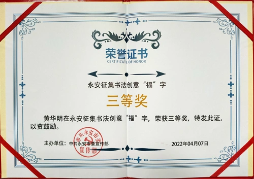在永安征集书法创意“福”字,荣获三等奖。